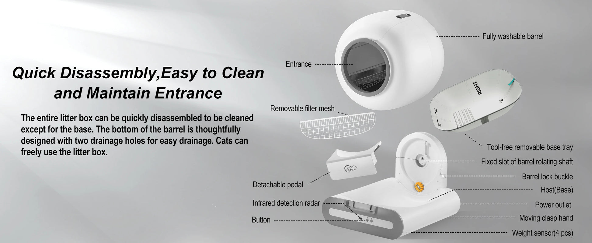 🚪【Integrated Safety Protection & Anti-Pinch Design】 DOEL automatic cat litter box, all-in one design, with 1 infrared sensor and 4 weight sensors for comprehensive monitoring and immediate pause for cat safety. Please be careful not to place the litter mat/carpet under the litter box to prevent weighing errors.